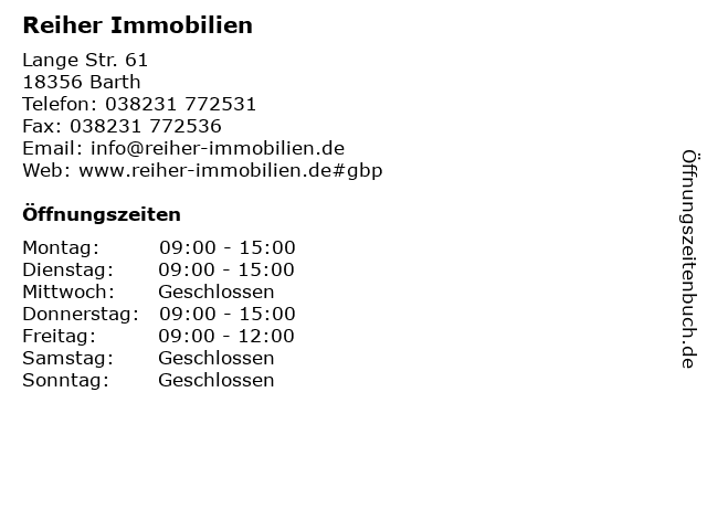 | Öffnungszeiten Reiher Immobilien in Barth anzeigen | |