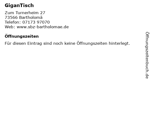 | Öffnungszeiten GiganTisch in Bartholomä anzeigen | |