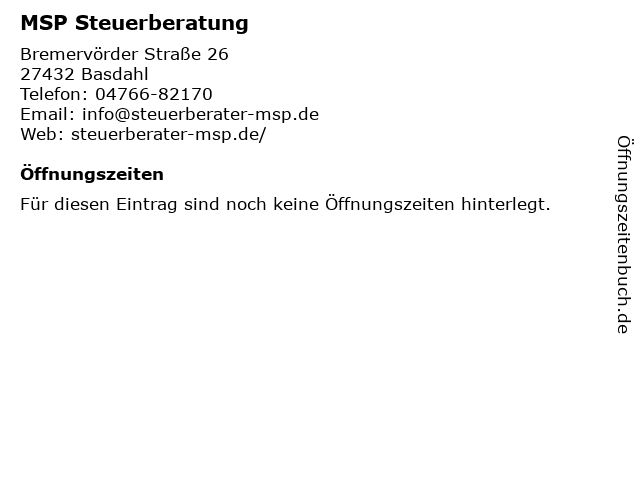 | Öffnungszeiten MSP Steuerberatung in Basdahl anzeigen | |