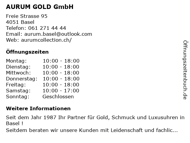 | Öffnungszeiten AURUM GOLD GmbH in Basel anzeigen | |