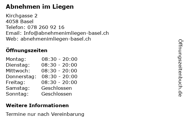 | Öffnungszeiten Abnehmen im Liegen in Basel anzeigen | |