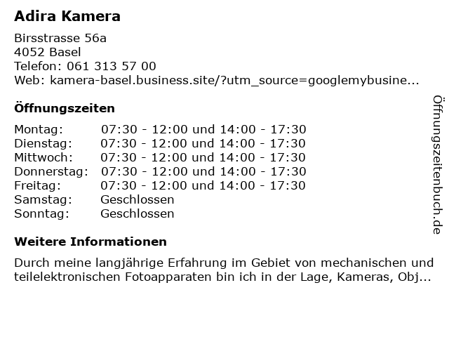 | Öffnungszeiten Adira Kamera in Basel anzeigen | |