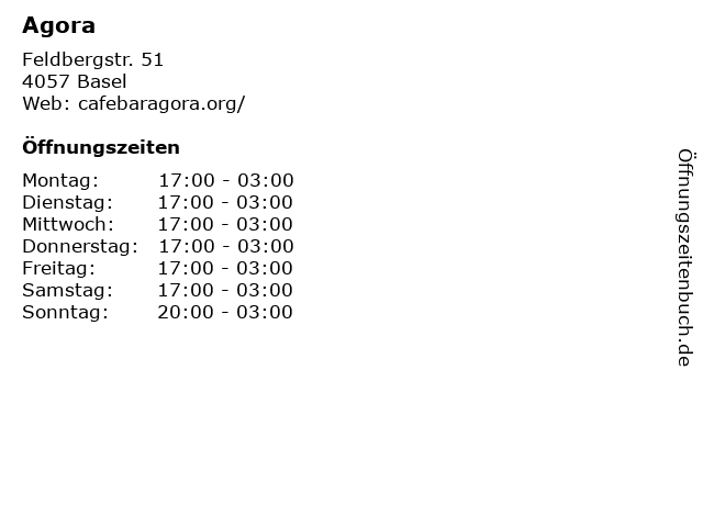 | Öffnungszeiten Agora in Basel anzeigen | |