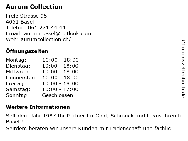 | Öffnungszeiten Aurum Collection in Basel anzeigen | |