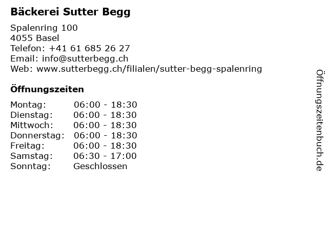| Öffnungszeiten Bäckerei Sutter Begg in Basel anzeigen | |
