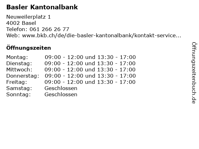 | Öffnungszeiten Basler Kantonalbank in Basel anzeigen | |
