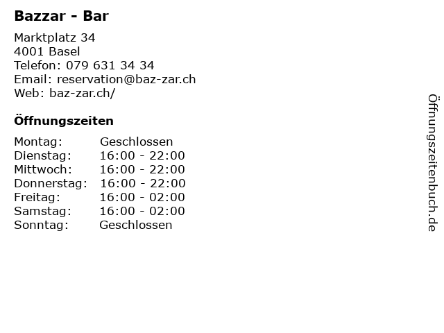 | Öffnungszeiten Bazzar - Bar in Basel anzeigen | |