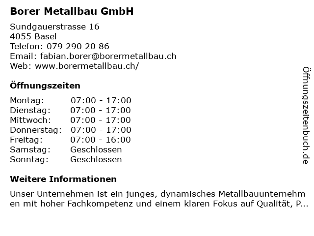 | Öffnungszeiten Borer Metallbau GmbH in Basel anzeigen | |