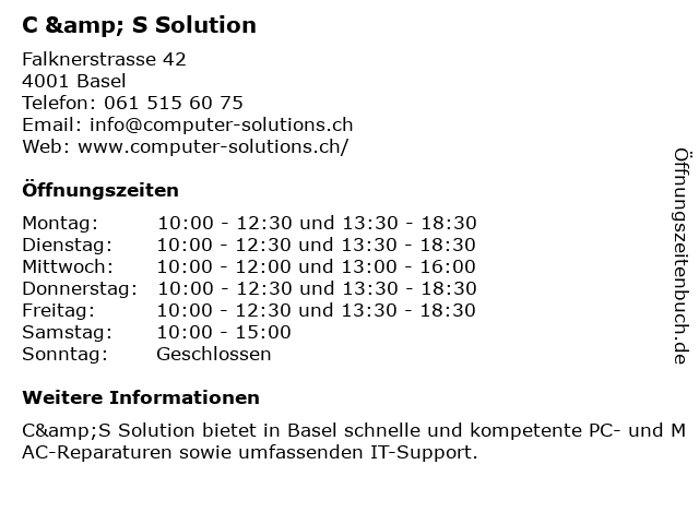 Öffnungszeiten C & S Solution in Basel anzeigen | |