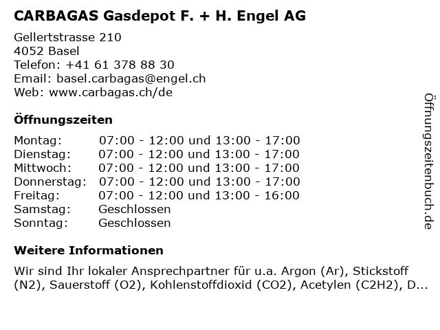 Branchen & Suchbegriffe zu CARBAGAS Gasdepot F. + H. Engel AG:acetylen, argon, ballongas, carbagas, co2 gasflasche, druckminderer, engel, f., gasdepot, gasflasche, h., helium, kohlendioxid, kohlensäure, minitop, propan, sauerstoff, schutzgas, schweissgas, stickstoff, tauschflasche, technische gase, trockeneis, wasserstoff |