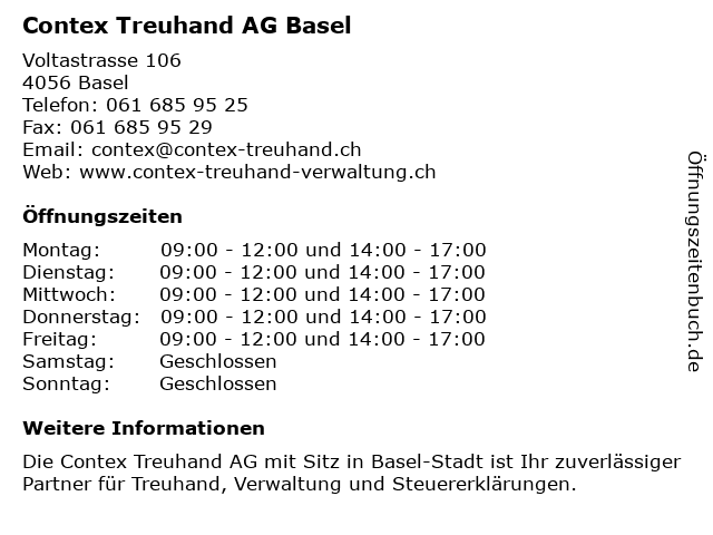 | Öffnungszeiten Contex Treuhand AG Basel in Basel anzeigen | |