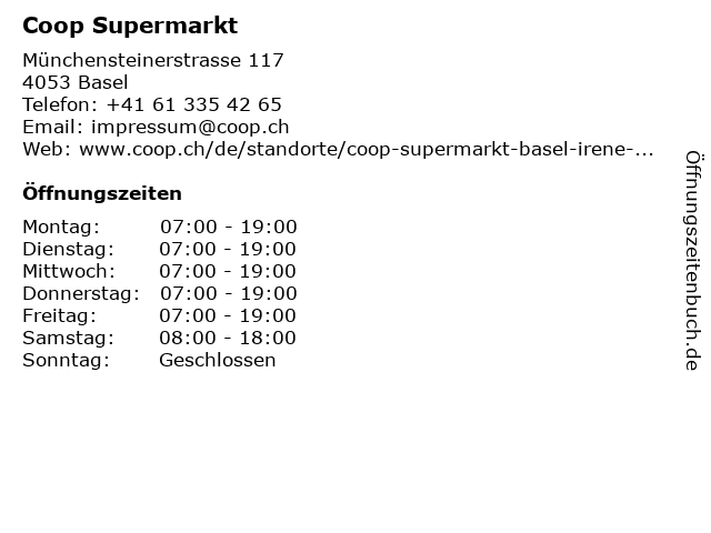 | Öffnungszeiten Coop Supermarkt in Basel anzeigen | |