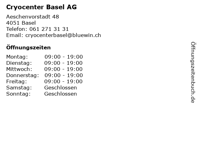| Öffnungszeiten Cryocenter Basel AG in Basel anzeigen | |