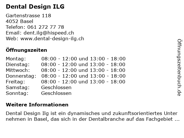 | Öffnungszeiten Dental Design ILG in Basel anzeigen | |