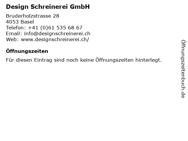 | Öffnungszeiten Design Schreinerei GmbH in Basel anzeigen | |