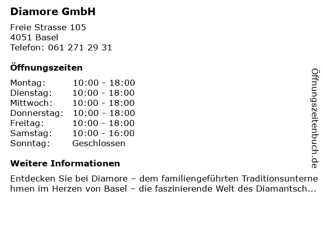| Öffnungszeiten Diamore GmbH in Basel anzeigen | |