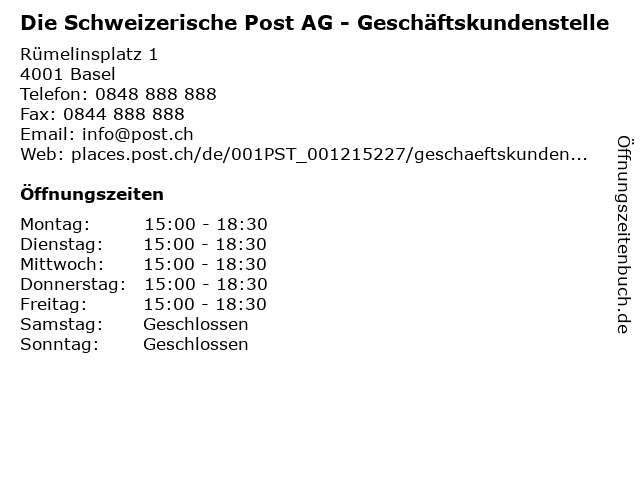 2 Die Schweizerische Post AG - Filiale Basel 1 Rüdengasse (Geschäftskundenschalter) (Entfernung: 0,10 km) Rüdengasse 1, 4001 Basel 6 Schweizerische Volkspartei (SVP) - Binningen (Entfernung: 2,50 km) Bruderholzrain 42b, 4102 Binningen |