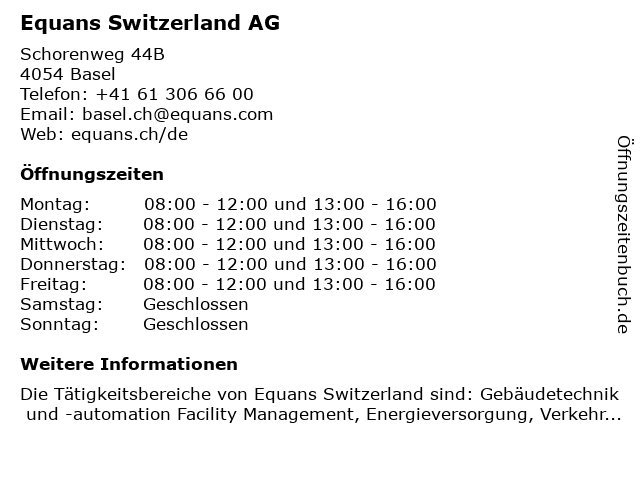 | Öffnungszeiten Equans Switzerland AG in Basel anzeigen | |