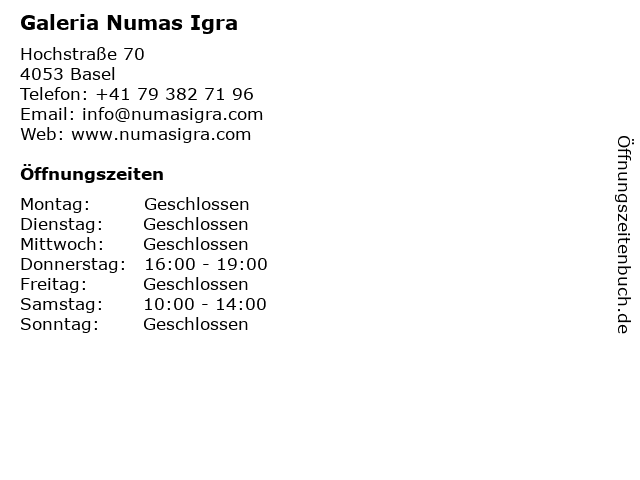 | Öffnungszeiten Galeria Numas Igra in Basel anzeigen | |