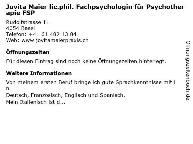 | Jovita Maier lic.phil. Fachpsychologin für Psychotherapie FSP anrufen | |
