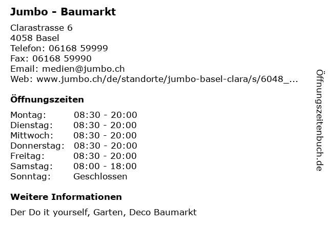 | Öffnungszeiten Jumbo - Baumarkt in Basel anzeigen | |