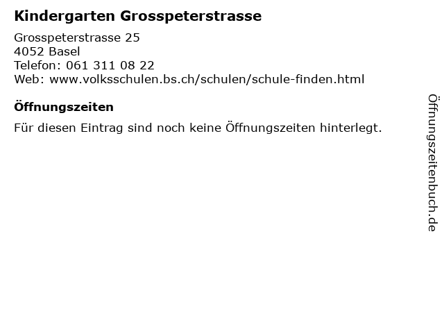 | Öffnungszeiten Kindergarten Grosspeterstrasse in Basel anzeigen | |