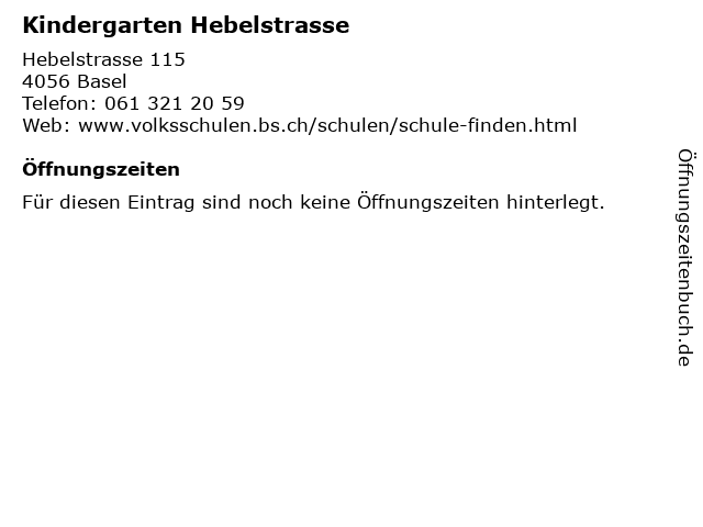 | Öffnungszeiten Kindergarten Hebelstrasse in Basel anzeigen | |