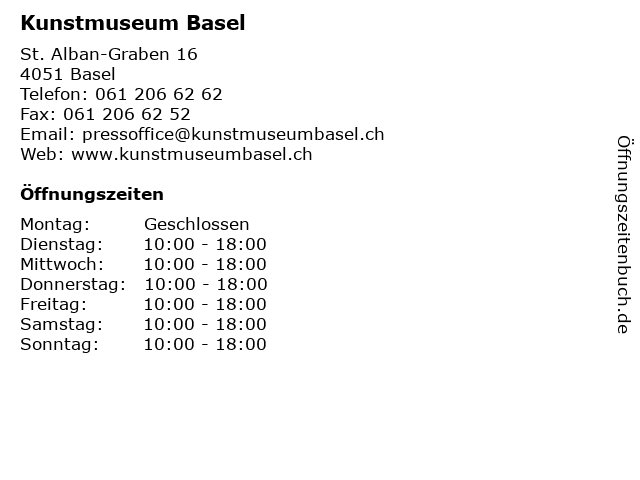 | Öffnungszeiten Kunstmuseum Basel in Basel anzeigen | |