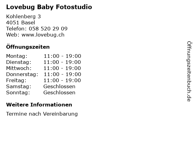 | Öffnungszeiten Lovebug Baby Fotostudio in Basel anzeigen | |