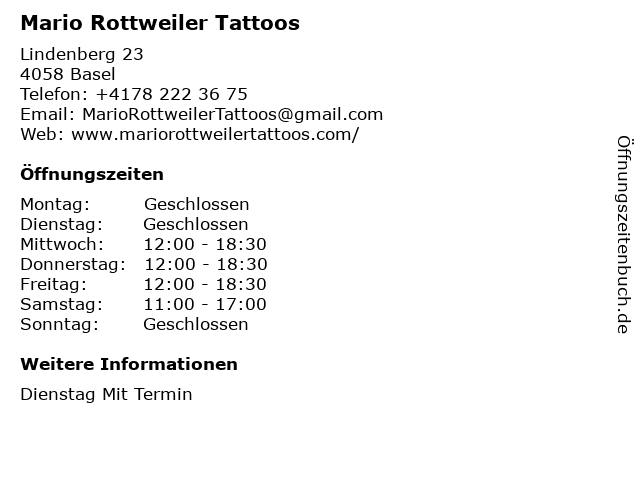 | Öffnungszeiten Mario Rottweiler Tattoos in Basel anzeigen | |