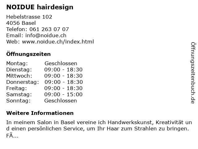 | Öffnungszeiten NOIDUE hairdesign in Basel anzeigen | |