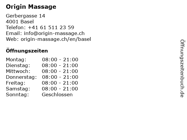 | Öffnungszeiten Origin Massage in Basel anzeigen | |