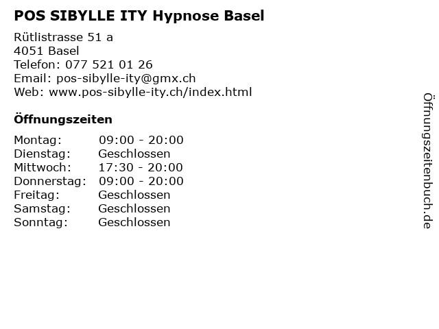 | Öffnungszeiten POS SIBYLLE ITY Hypnose Basel in Basel anzeigen | |