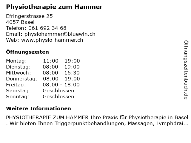 | Öffnungszeiten Physiotherapie zum Hammer in Basel anzeigen | |