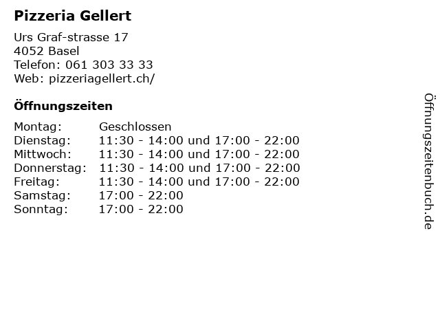 | Öffnungszeiten Pizzeria Gellert in Basel anzeigen | |
