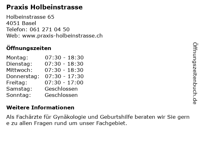 | Öffnungszeiten Praxis Holbeinstrasse in Basel anzeigen | |