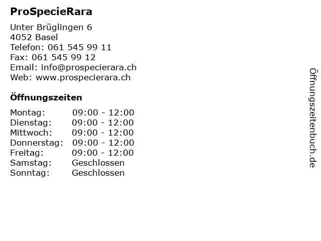 | Öffnungszeiten ProSpecieRara in Basel anzeigen | |