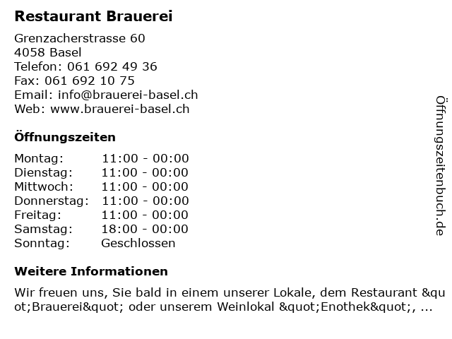 | Öffnungszeiten Restaurant Brauerei in Basel anzeigen | |