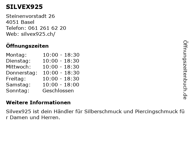| Öffnungszeiten SILVEX925 in Basel anzeigen | |