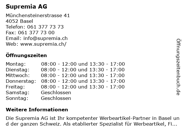 | Öffnungszeiten Supremia AG in Basel anzeigen | |