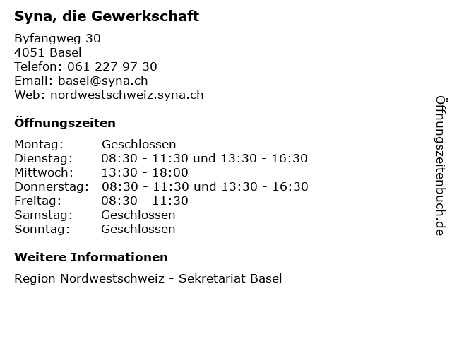 | Öffnungszeiten Syna, die Gewerkschaft in Basel anzeigen | |