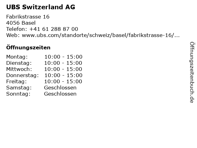 | Öffnungszeiten UBS Switzerland AG in Basel anzeigen | |