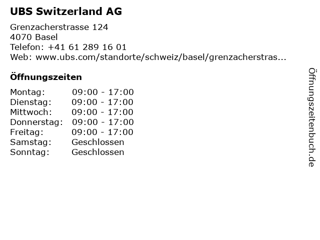 | Öffnungszeiten UBS Switzerland AG in Basel anzeigen | |