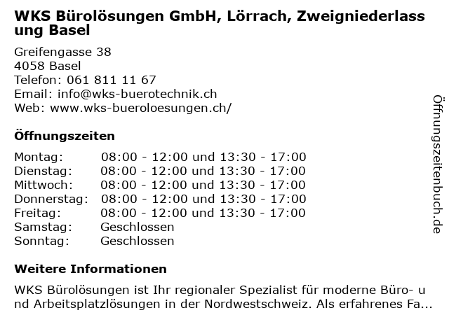 Branchen & Suchbegriffe zu WKS Bürolösungen GmbH, Lörrach, Zweigniederlassung Basel:basel, büroeinrichtung, bürolösungen, wks, zweigniederlassung |