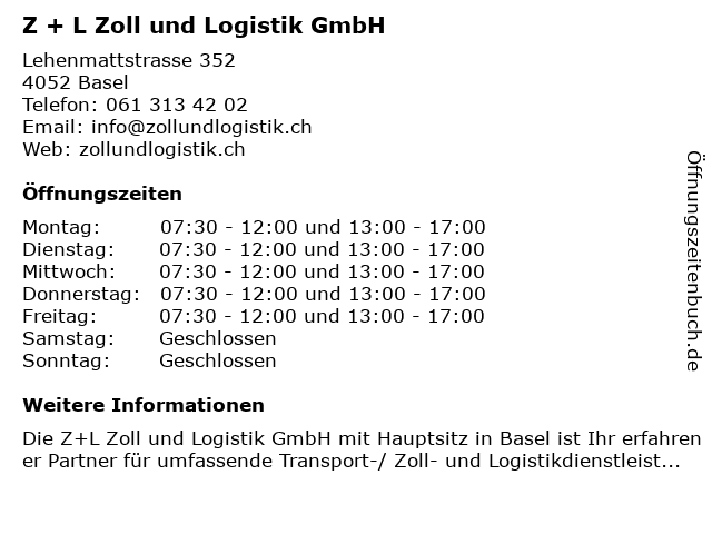 | Öffnungszeiten Z + L Zoll und Logistik GmbH in Basel anzeigen | |