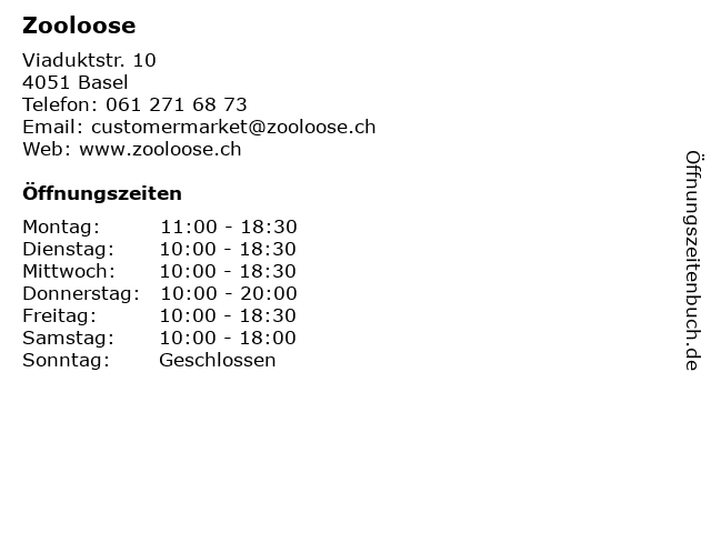| Öffnungszeiten Zooloose in Basel anzeigen | |