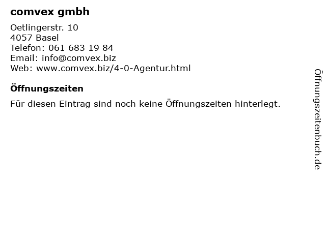| Öffnungszeiten comvex gmbh in Basel anzeigen | |