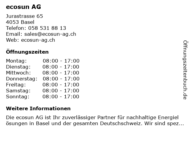 | Öffnungszeiten ecosun AG in Basel anzeigen | |