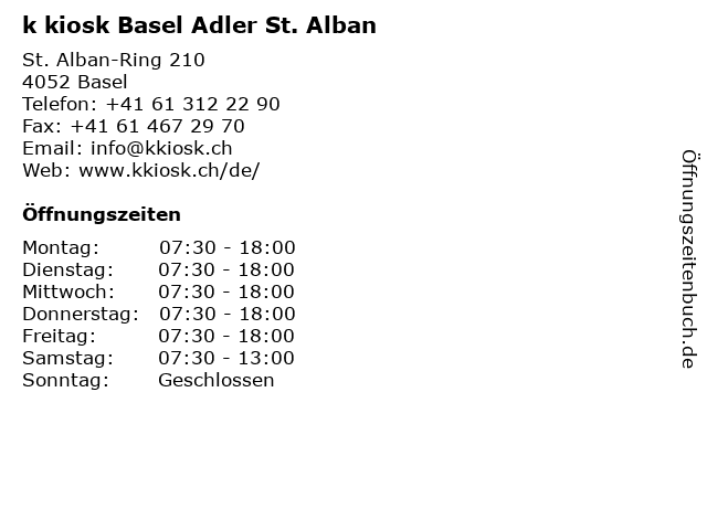| Telefonnummer k kiosk Basel Adler St. Alban in Basel (+41 61 312 22 90) anrufen | |