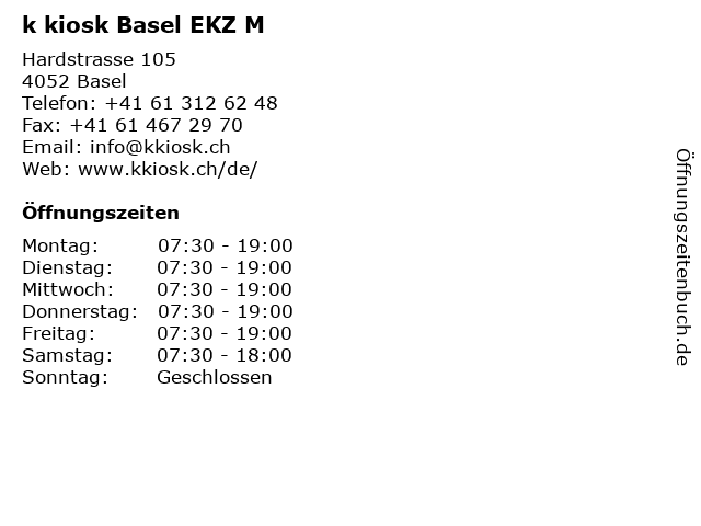 | Öffnungszeiten k kiosk Basel EKZ M in Basel anzeigen | |